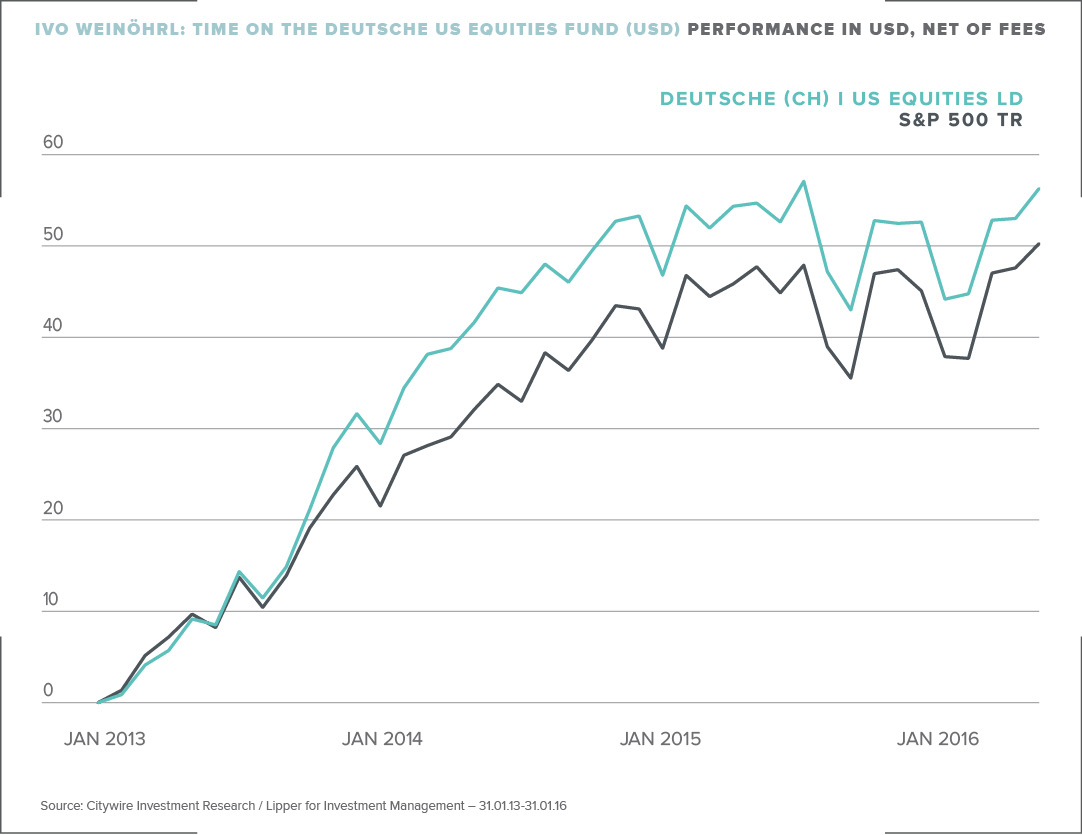 Ivo Weinöhrl hasn’t managed any funds tracked by Citywire since 2016, so it’s impossible to gauge his recent managerial skill. However, his performance between 2013 and mid-2016 was very strong, with his Deutsche US Equities Fund comfortably outperforming the S&P 500 index – an index that’s notoriously difficult to beat given its high analyst coverage and efficiency.