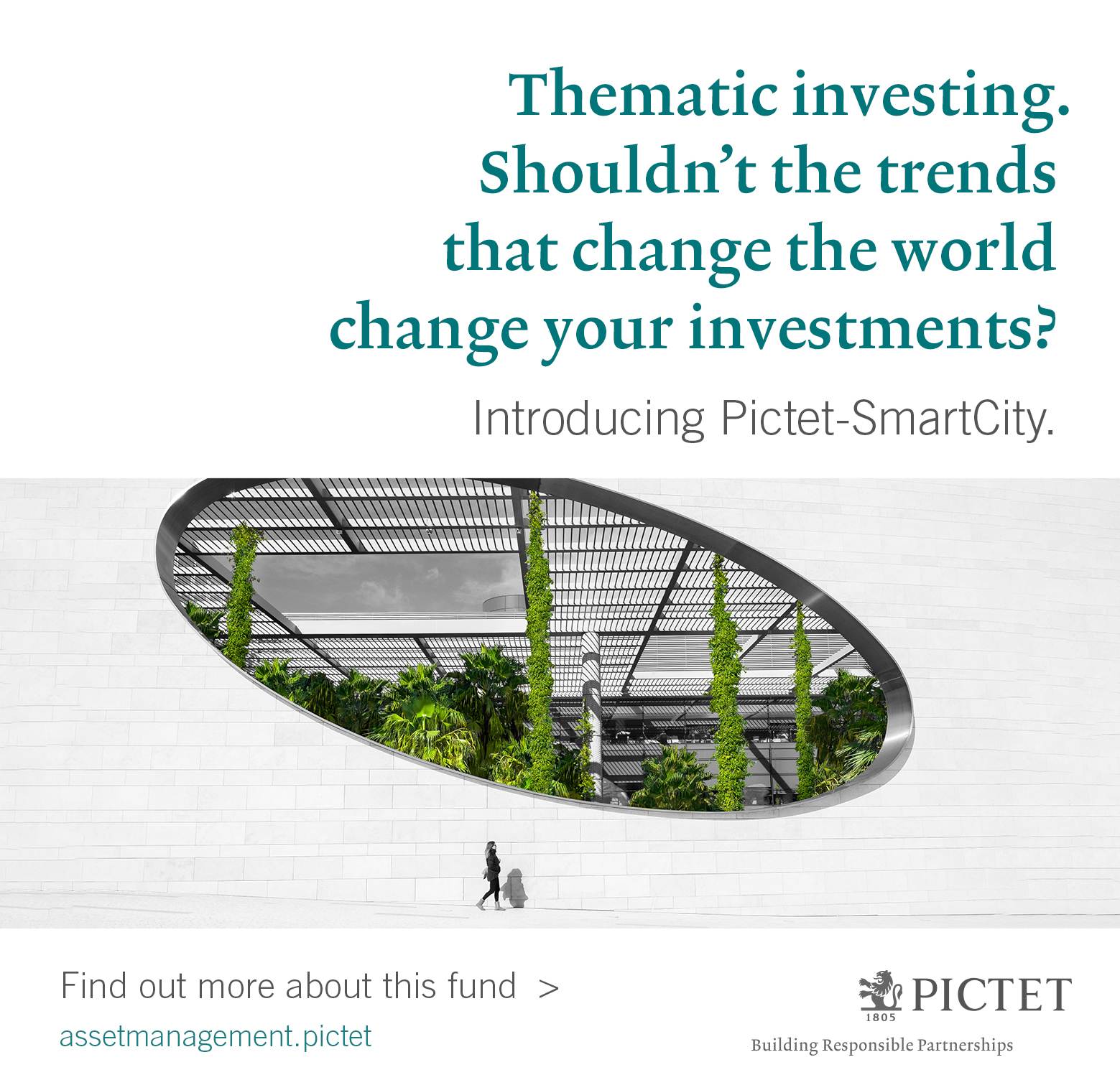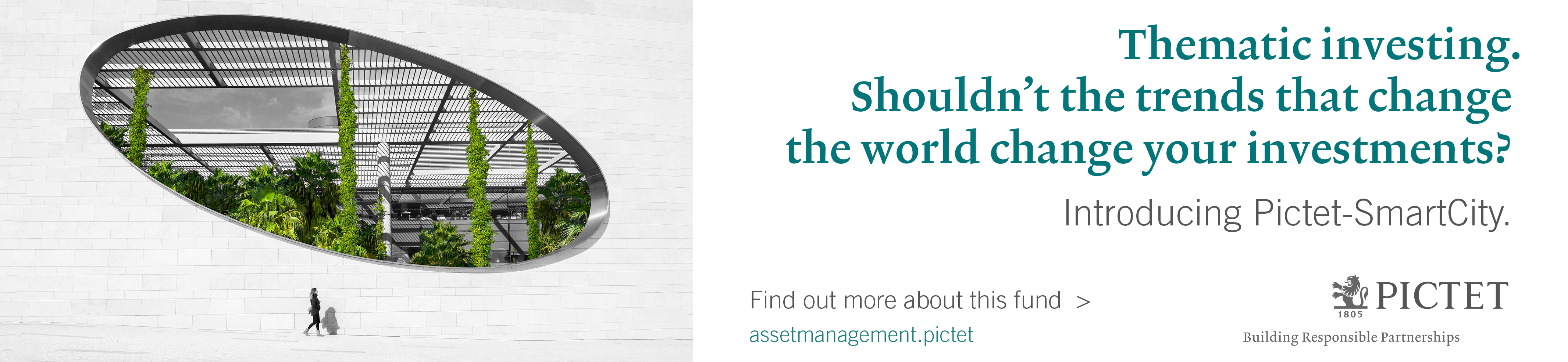 Pictet-SmartCity is a compartment of the Luxembourg SICAV Pictet. The latest version of the fund’s prospectus, KIID (Key Investor Information Document), regulations, annual and semi-annual reports are available free of charge on assetmanagement.pictet or at the fund’s management company. Pictet Asset Management (Europe) S.A., 15, avenue J. F. Kennedy, L-1855 Luxembourg. Before making any investment decision, these documents must be read and potential investors are recommended to ascertain if this investment is suitable for them in light of their financial knowledge and experience, investment goals and financial situation, or to obtain specific advice from an industry professional. Any investment incurs risks, including the risk of capital loss. All risk factors are detailed in the prospectus.